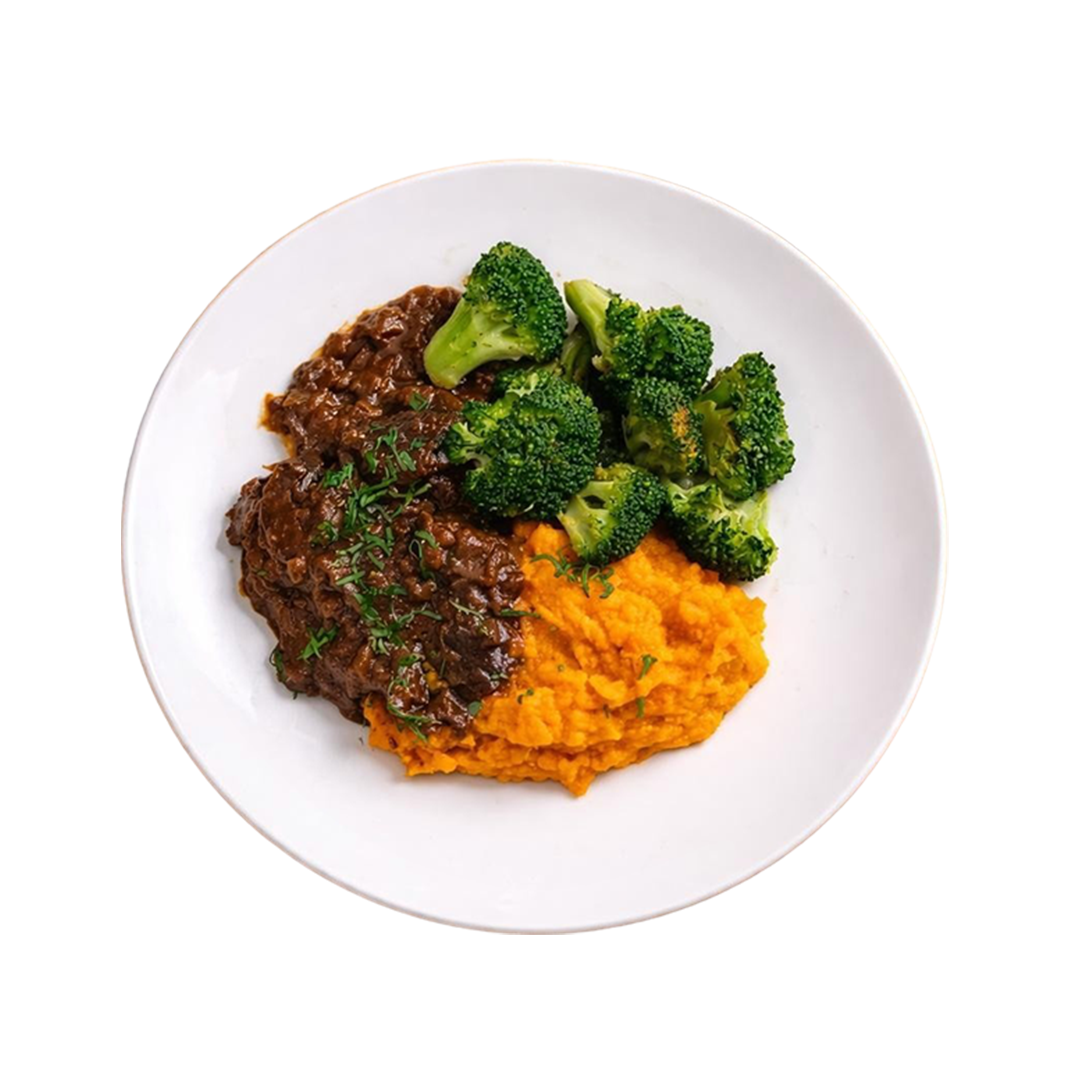 Slow-braised smoky BBQ beef with sweet potato mash and roasted broccoli.