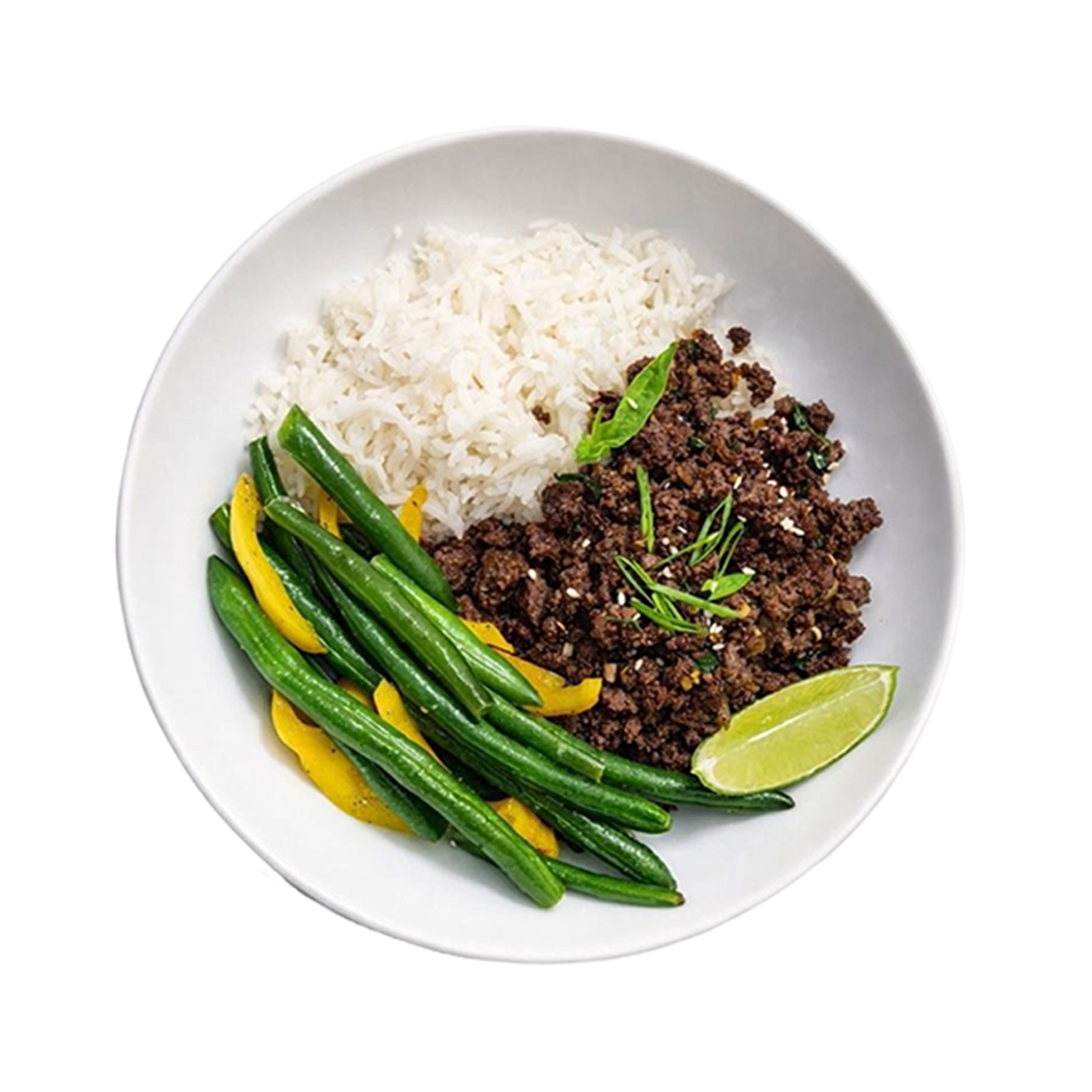 Thai basil beef in a garlicky soy-chili sauce with jasmine rice and stir-fried green beans & peppers.